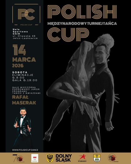 Już 14 marca 2026 roku zapraszamy ponownie na Polish Cup do Jelcza-Laskowic. Taneczne zmagania zwieńczy uroczysta gala, którą poprowadzi znakomity tancerz i osobowość medialna, doskonale znany szerokiej publiczności z programu Taniec z Gwiazdami – Rafał Maserak